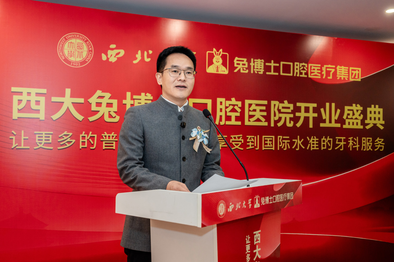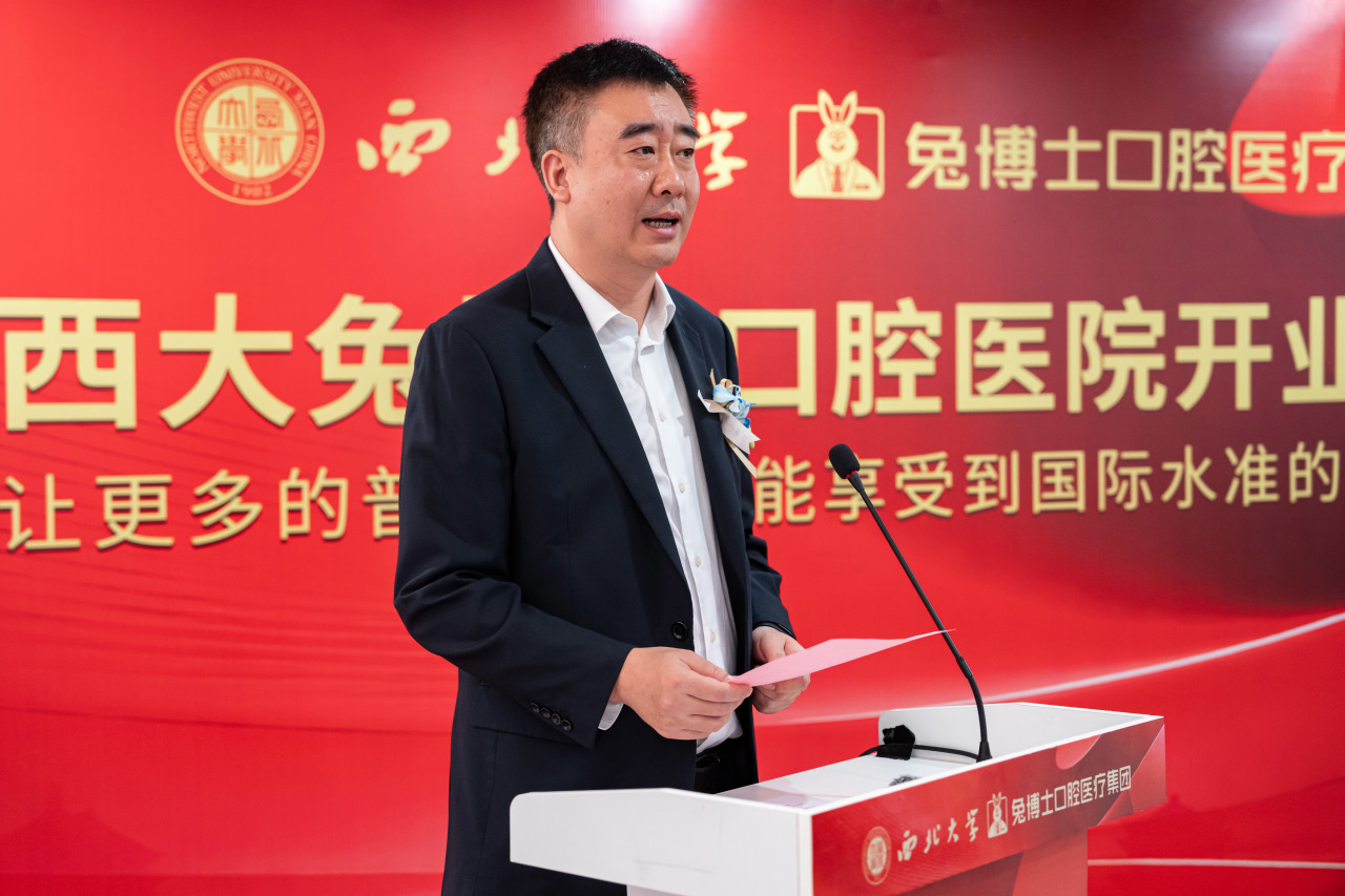 兔博士口腔医疗集团董事长王鸿应在致辞中表示:西大兔博士口腔医院从与西北大学签署战略合作协议,与碑林区张家村街道办签署招商引资协议,到今日的盛大开业,离不开各级党和政府、医疗主管机构,各级地方政府领导和社会各界的鼎力支持与深切关怀。西大兔博士口腔医院的诞生,承载着一个非凡而卓越的主体——“西北大学”。这不仅是口腔医院卓越的标识,更是一份学术血脉的传承与一份沉甸甸的责任。回溯合作历程,我们被西北大学“公诚勤朴”的校训精神所感染,被其严谨求实的校风和开拓创新的教育初心所鼓舞。