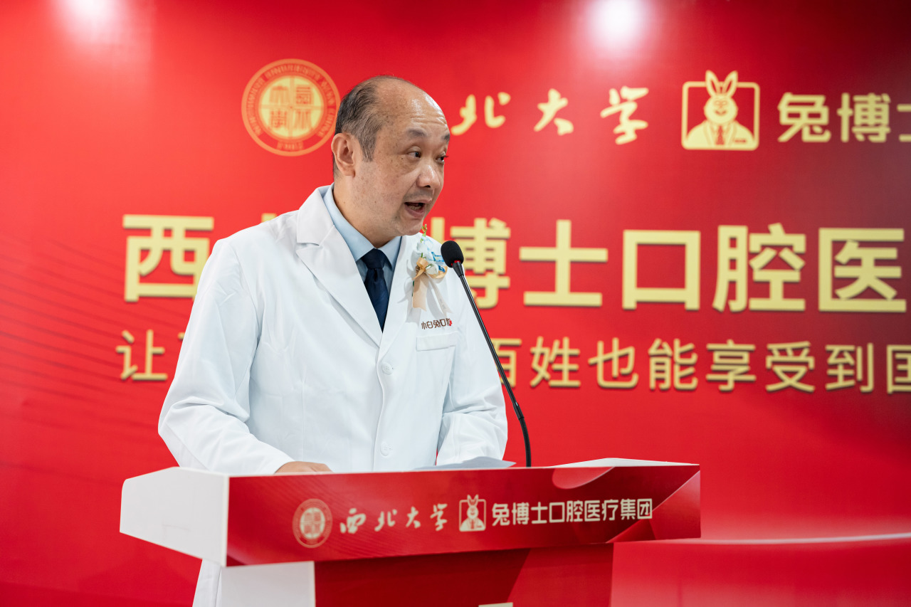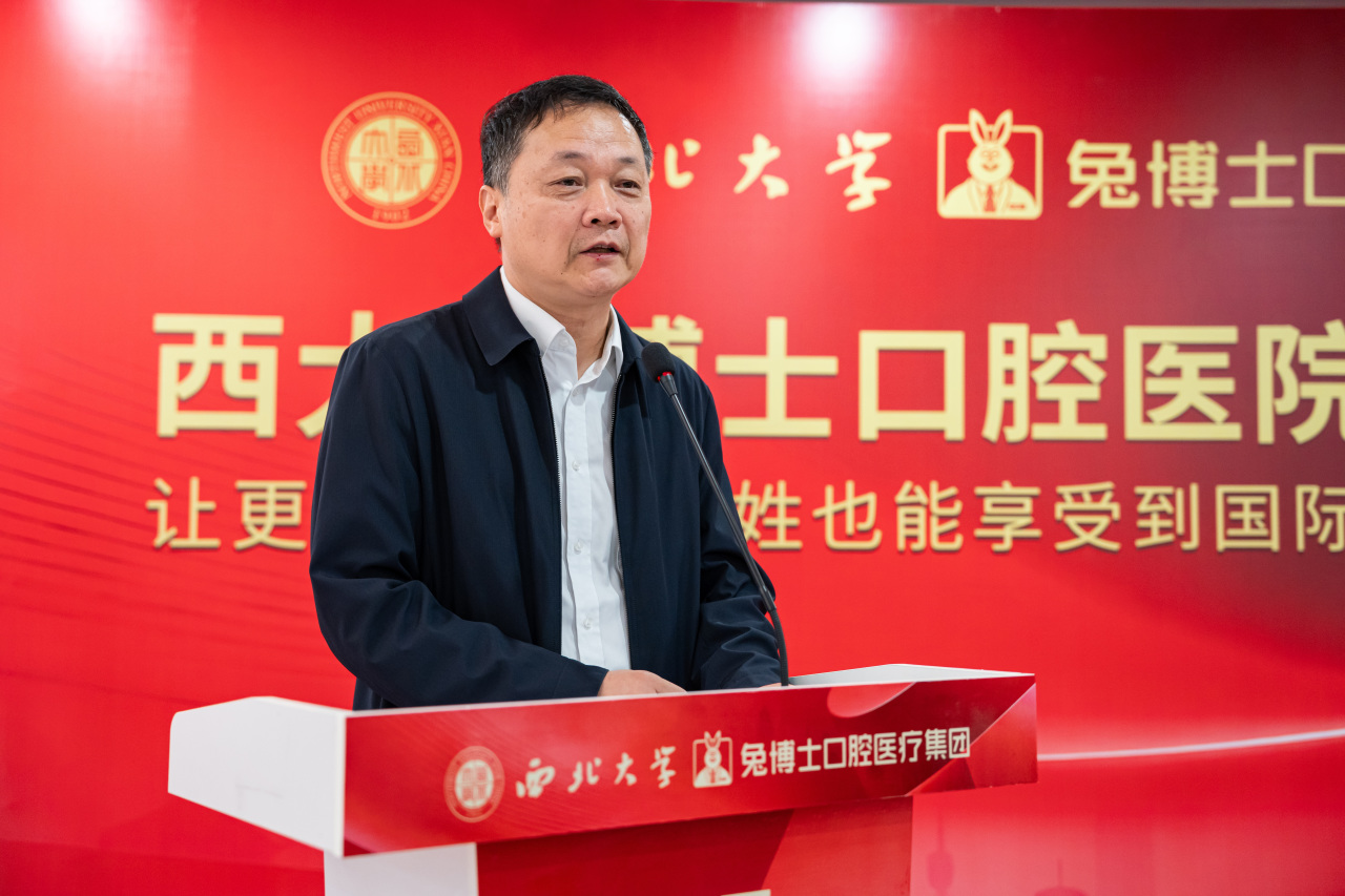 西北大学党委常委、副校长陈富林在致辞中表示:西北大学是国家“211工程”建设院校,首批进入国家“双一流”建设的高水平大学。兔博士口腔是西北地区首家新三板挂牌上市、陕西本土发展起来的高水平、强合规的口腔医疗品牌。本次与兔博士口腔医疗集团共同打造“研教医”于一体的教学医院,将对西北大学口腔医学系的进一步发展奠定良好的基础。