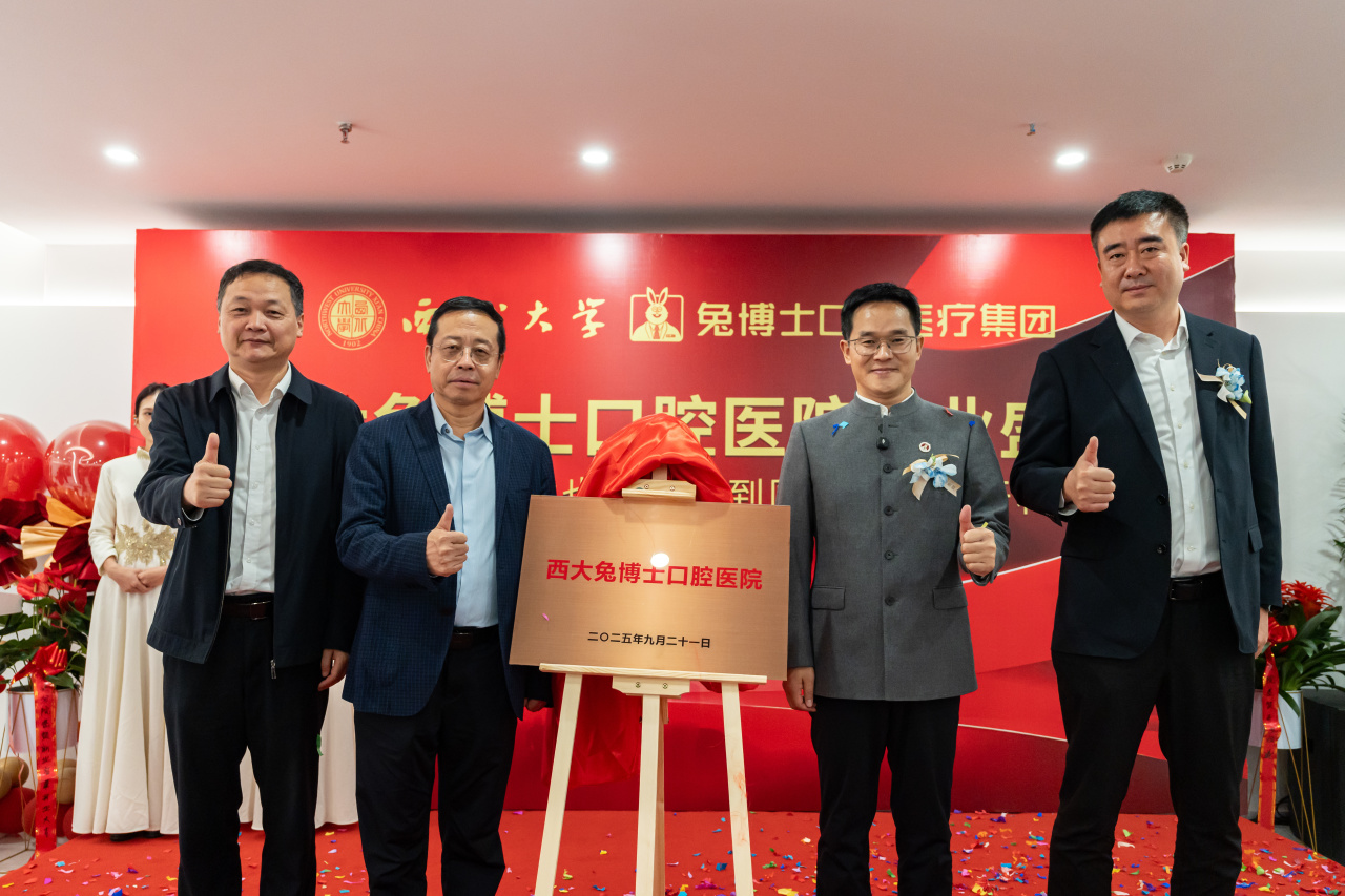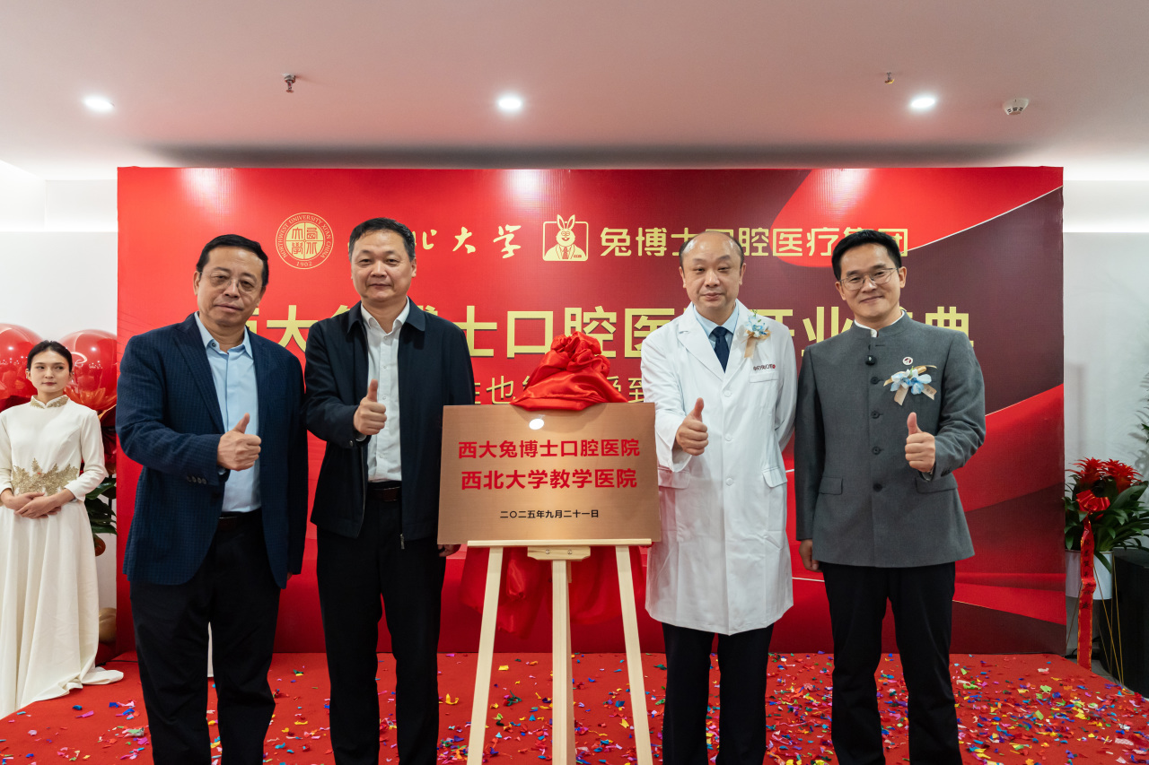 典礼仪式中,西安市碑林区张家村街道办主任李岩、西北大学副校长陈富林、西北大学医学院院长赵钢、兔博士口腔医疗集团董事长王鸿应共同为“西大兔博士口腔医院”揭牌。